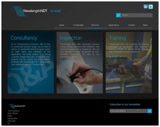New elements on the site tie in with the popularity and expansion of social media channels. A defined “News” area is now available containing the latest press releases and information from Wavelength NDT. Hand in hand with this, there is now access to Twitter, Linked In and an RSS Feed subscription, so visitors can get interact and stay up-to-date with Wavelength’s projects and industry updates. Users can also sign up to receive future e-casts and newsletters.